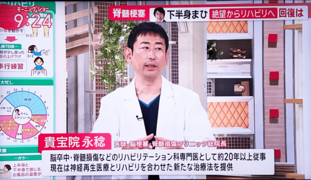 脳梗塞・脊髄損傷クリニックの総院長である貴宝院永稔医師が、令和6年10月4日の午前8時から始まる「羽鳥慎一モーニングショー」に出演し、脊髄梗塞を患われた「体操のおにいさん」や「ひろみちお兄さん」の愛称で知られるタレント佐藤弘道さんの病状やリハビリテーションに対する解説・コメントを行わせていただきました。