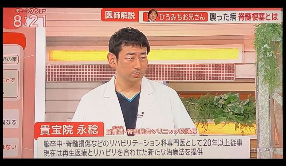 当脳梗塞・脊髄損傷クリニック銀座院の院長である貴宝院永稔医師が、令和6年6月14日の午前9時から始まる「羽鳥慎一モーニングショー」に出演し、同月6/13にニュースになった「体操のおにいさん」や「ひろみちお兄さん」の愛称で知られるタレント佐藤弘道さんの「脊髄梗塞」に対する医学的に的確なコメントを行わせていただきました。
